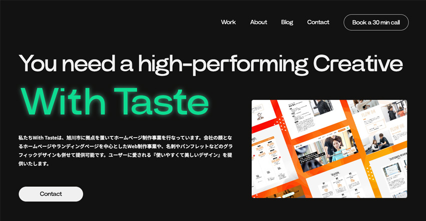 「With Taste」は、各分野のプロフェッショナルが集まるクリエイティブチームです。UXUIデザイン専門会社と海外在住の経験から、国内外問わず最新のトレンドを落とし込むディレクターと、東京のデザイン業界で10年以上のキャリアを持つデザイナー、また、スマホ対応はもちろん、アニメーションや、ワードプレスなどのCMS構築なども手掛けるエンジニアから構成されています。主な事業はホームページやLPなどのWeb制作事業です。名刺やロゴ、パンフレットなどのグラフィックデザインも得意としており、Webだけではなく、ビジネスに必要なデザインを一貫性を持って提供することが得意です。また、少人数で業務を行なっているため、レスポンスも早く小回りが利き、何よりも低単価での納品が可能です。